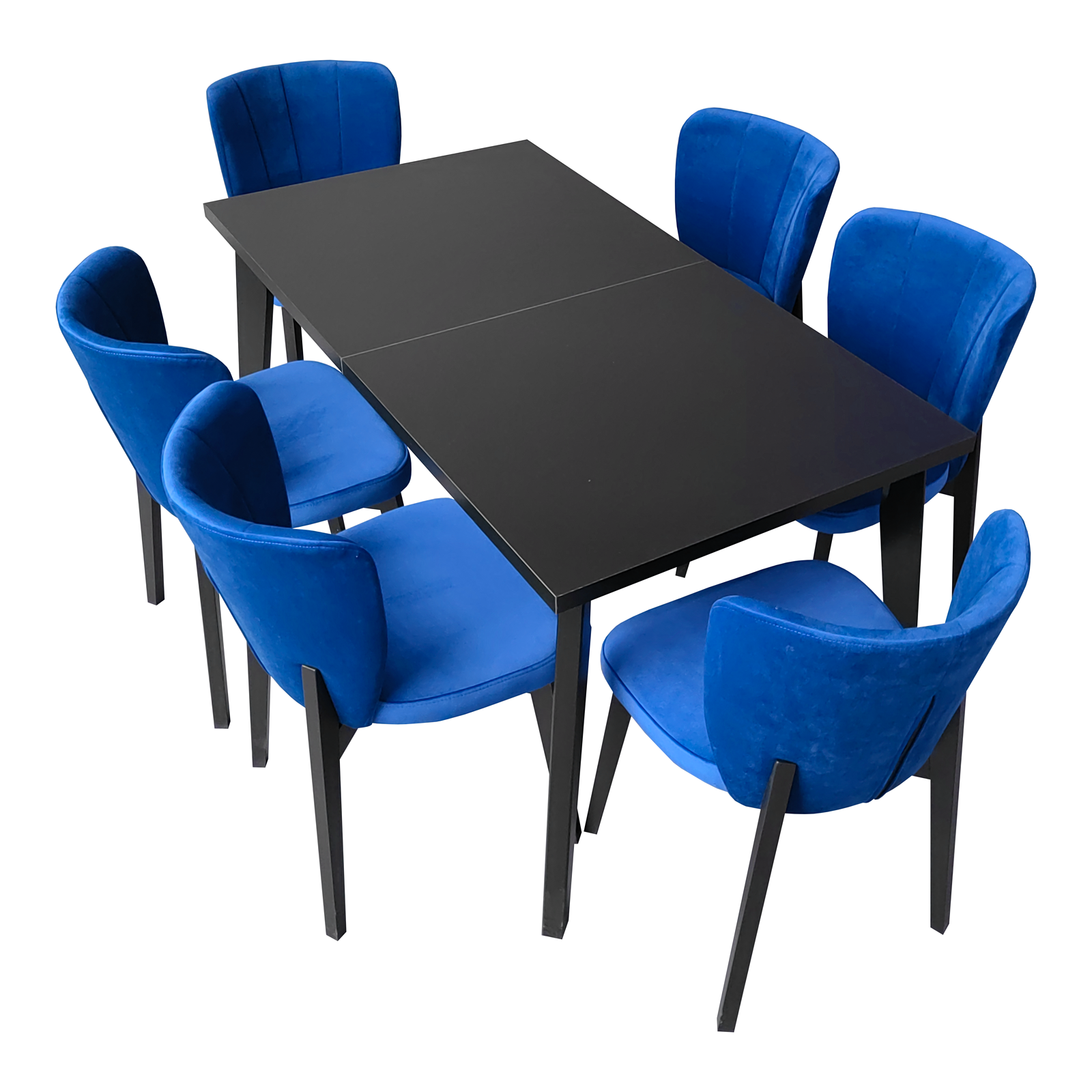 Prostokątny czarny stół z 6 krzesłami niebieskimi
