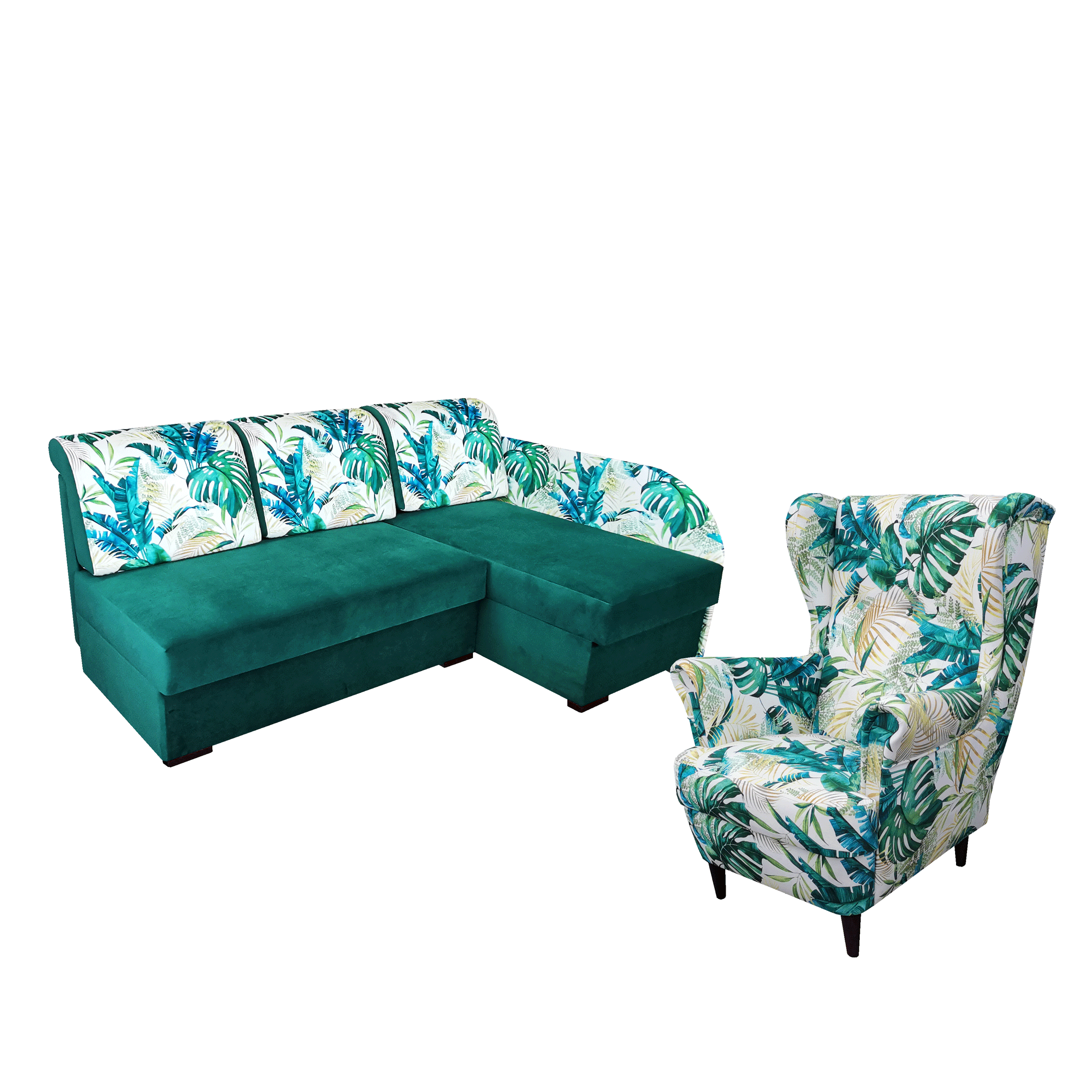Mały narożnik Emilia z dużym spaniem i fotelem Uszak