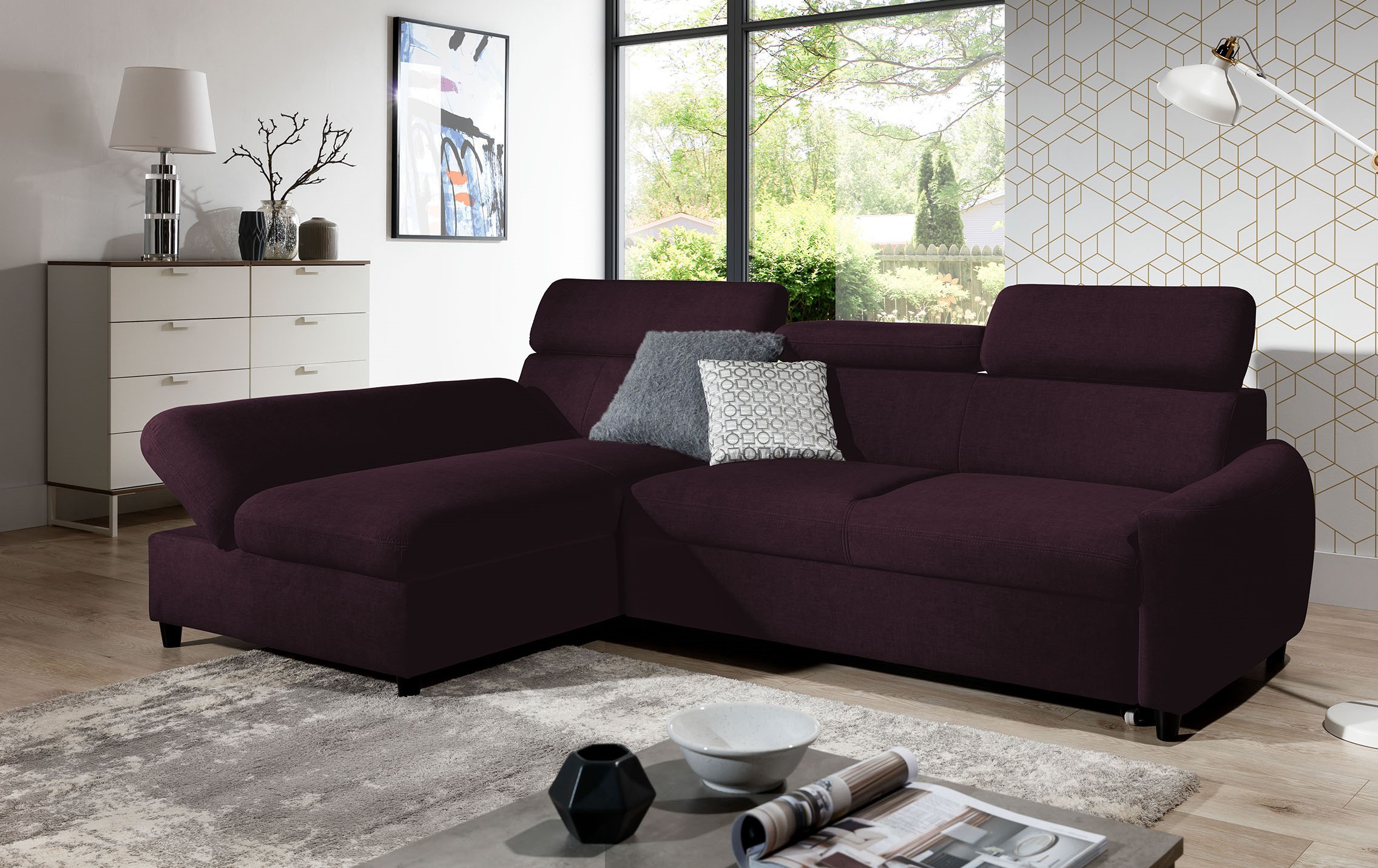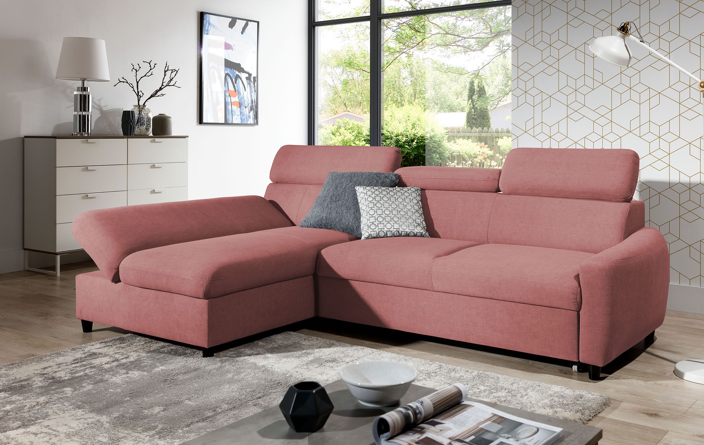 Mały narożnik z funkcją spania z profilowanymi poduchami 1 × 2 450,00 zł - ×
