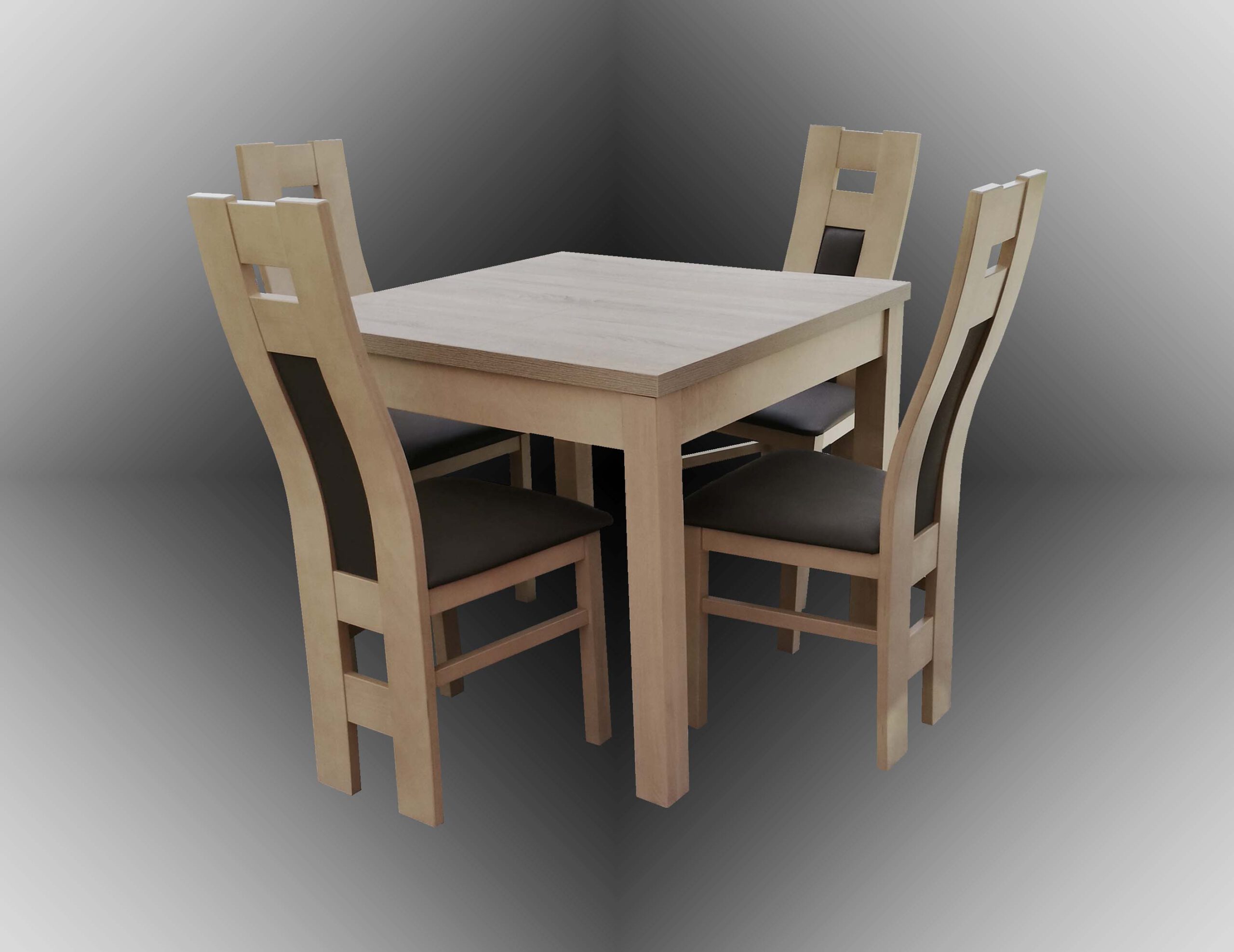 Nowoczesny stół w kolorze dąb sonoma z czterema krzesłami drewnianymi.